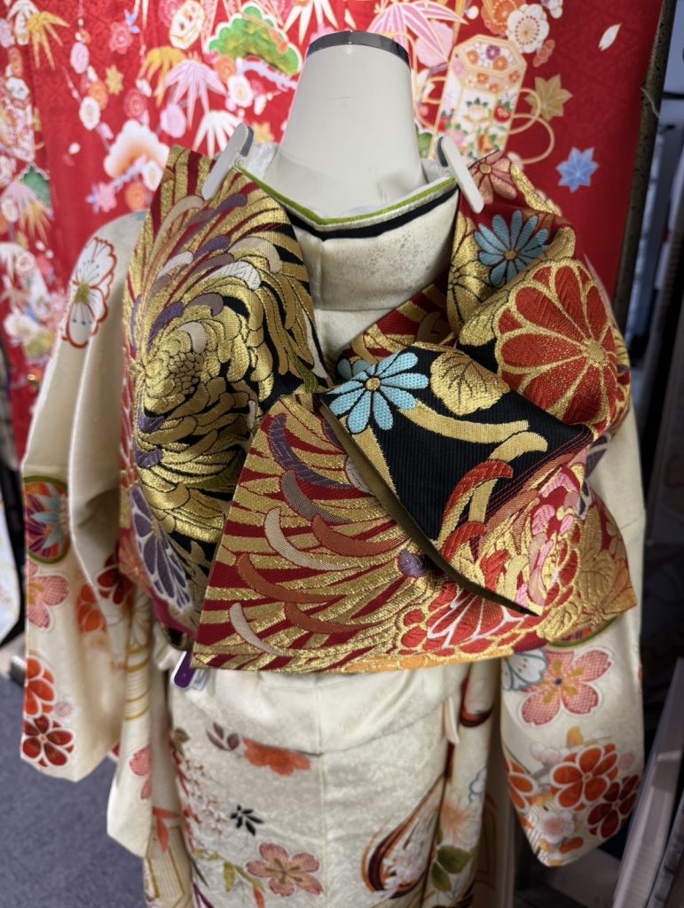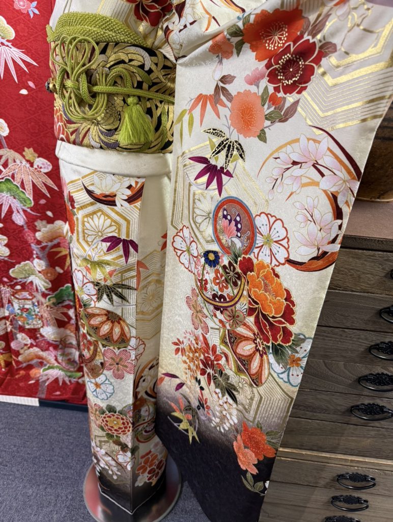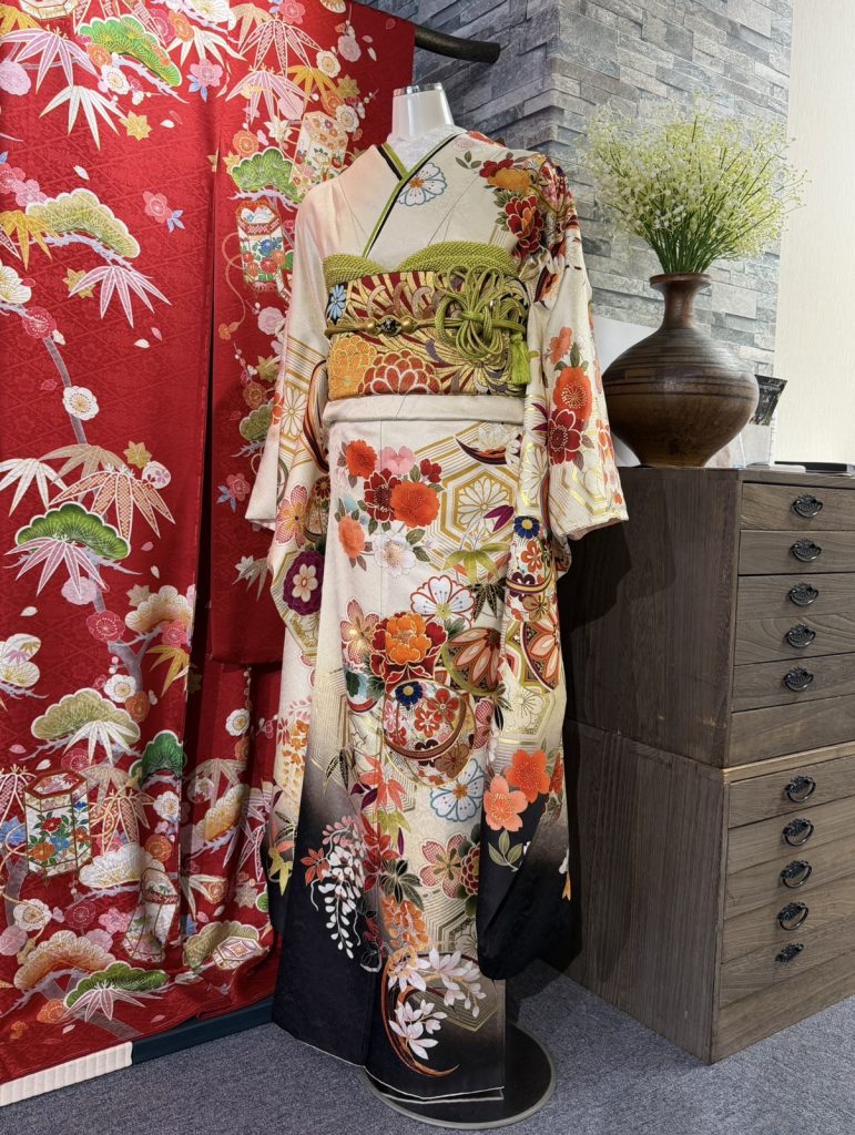 2025/11/16 Blog 振袖のご紹介 こんにちは!お久しぶりです! 本日も可愛らしい振袖をご紹介させていただきます! こちらの振袖は淡いクリーム色をベースに裾に向かって黒のぼかしが入っております! デザインは桜や牡丹、毬などたくさんの可愛い柄がデザインされております✧︎*。 帯には大きな菊の花がデザインされており、華やかに仕上がります! まだまだ沢山の振袖を取り揃えておりますので、ぜひお店にお気軽にご来店ください❤︎ Back to List