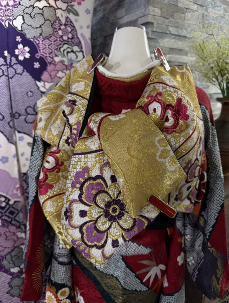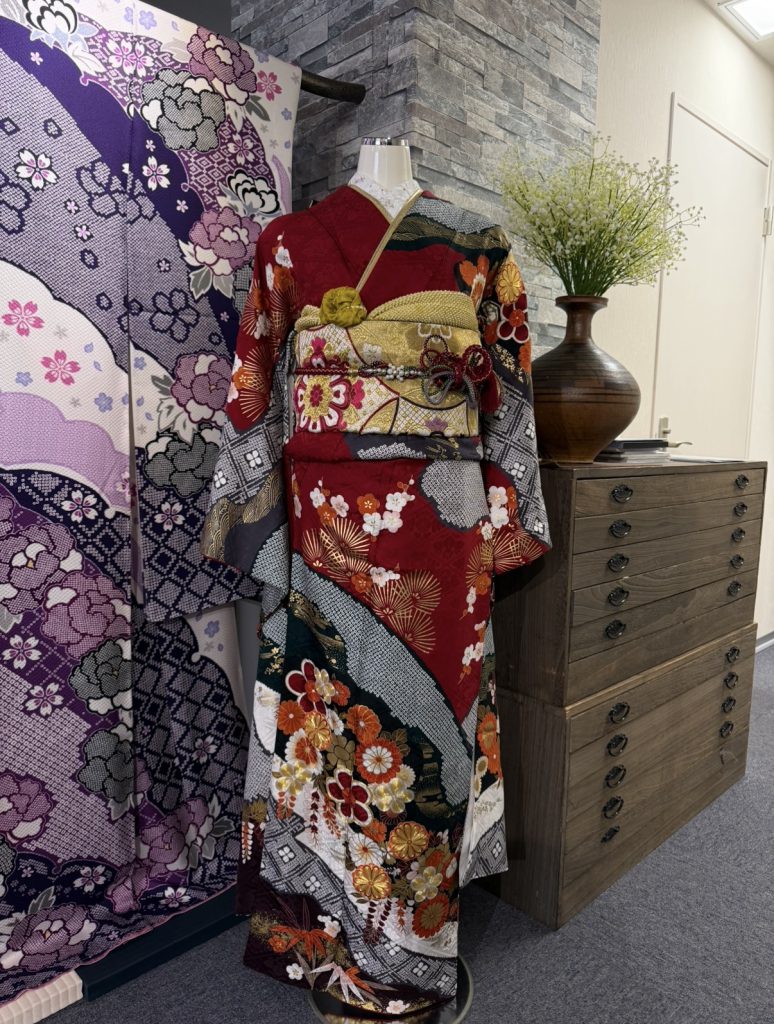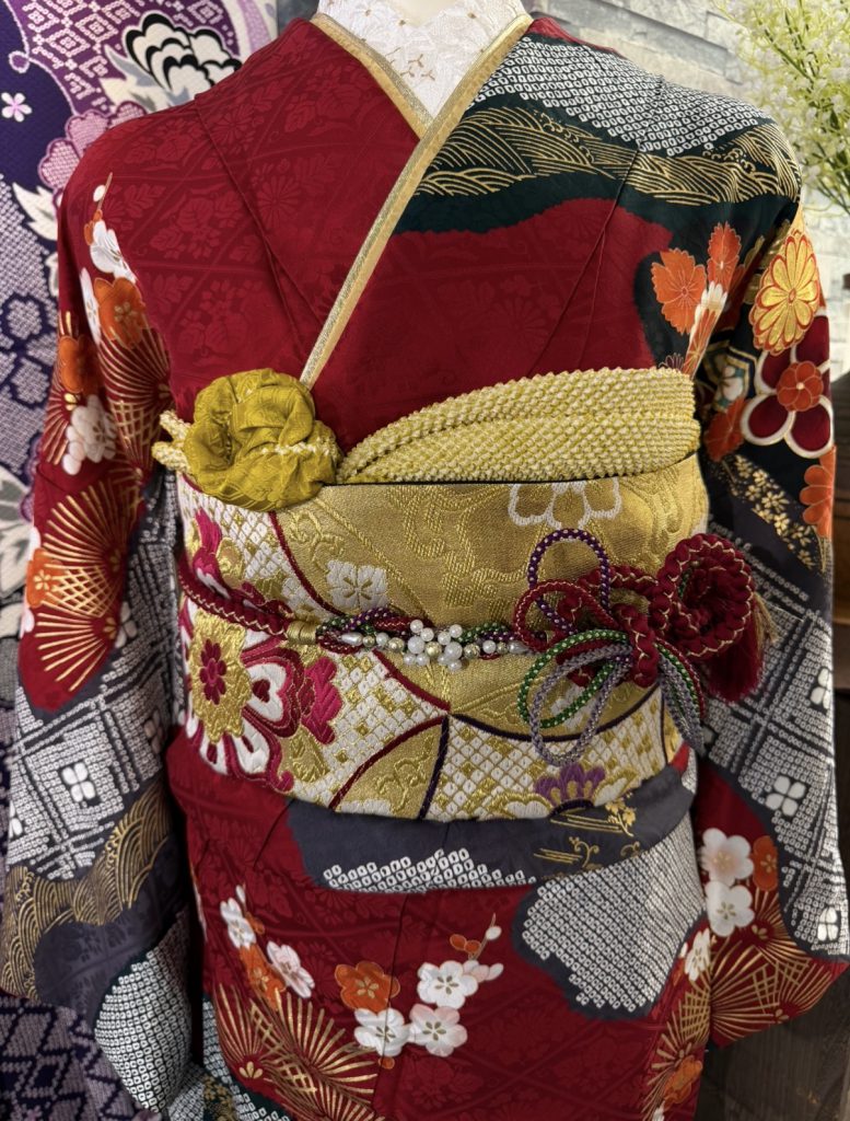 2026/03/06 Blog 振袖のご紹介⟡.· 今回ご紹介する振袖は古典柄がベースとなっている振袖です❤︎ 深い赤色に差し色として黒、白、金、オレンジなど色鮮やかにまとまっており、大人っぽく可愛い印象になる振袖です❤︎ デザインには菊、松、梅、扇の縁起柄でお上品なデザインとなっております⟡.· 帯では金地をベースとし、帯締めでリボンを作ったりと様々なデザインで印象を変えることができます୨୧ 紫色の大きい牡丹で後ろから見ても華やかな見た目になります❤︎ 他にもたくさんの振袖をご用意しておりますのでぜひお気軽にお店にお越しください!! Back to List